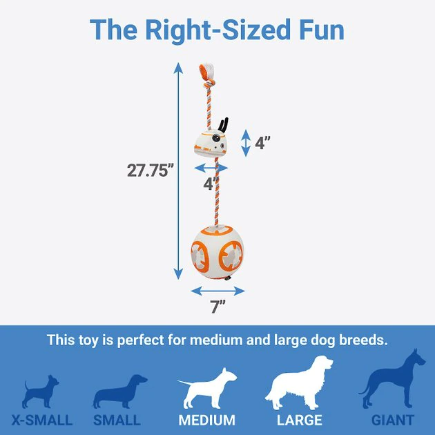This skittish little ball of energy modeled after BB-8™ is available only at Chewy and has a two-piece design guaranteed to delight any canine Star Wars™ superfan. The head and body have a classic cotton/poly rope running through them, and they’re connected by hook-and-loop fasteners. Each piece is covered in unique ballistic nylon fabric that’s different from a traditional plush toy, with soft stuffing and a squeaker deep inside. This toy is made for all types of fun and games for your furry Jedi. Take the two pieces apart, switch it up and keep your dog guessing during your play sessions together!