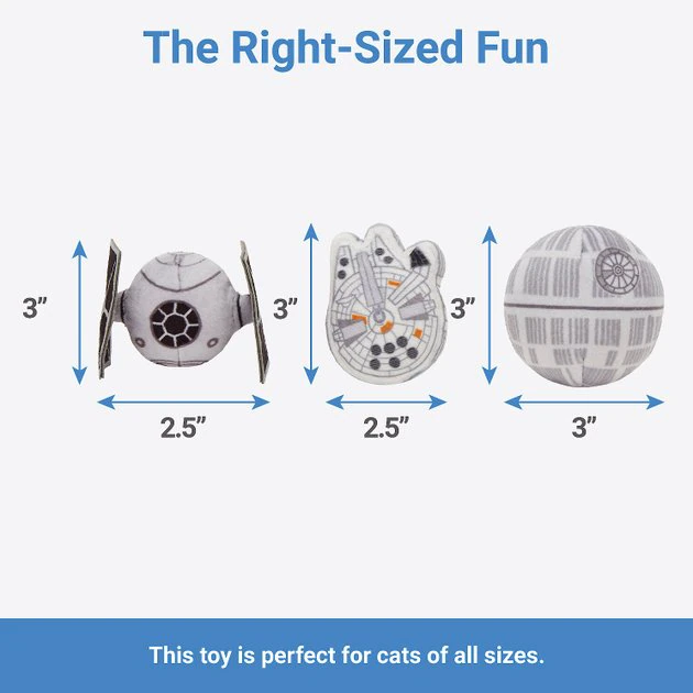 Bring home a whole fleet of ships for your Star Wars™ superfan, available only at Chewy! This three-pack of kitty toys includes three of their favorite spaceships—the Death Star™, a TIE Fighter and, of course, the Millennium Falcon™. Each of these toys is stuffed with catnip to drive your kitty wild and keep them batting, biting and clawing away at their new favorite toys. However your kitty likes to play with their toys, this three-pack of classic ships can send their playtime into hyperspace!