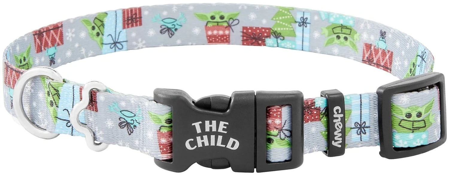 This holiday-themed Star Wars: The Mandalorian™ collar, featuring The Child and lots of brightly colored presents, will keep your canine companion feeling festive all through the holiday season. Made with durable, high-quality polyester that has an Ultra-Weld™ seal, it’s strength-tested to withstand up to seven times the maximum recommended weight for each size. Putting it on your dog is easy with the plastic rounded-edge buckle, plus the nickel-coated D-ring makes it simple to snap a leash on and get going. They come in different sizes you can adjust for a custom fit and a separate ring to attach an ID tag. Grab the matching leash and harness to complete the whole walkwear set, only at Chewy.